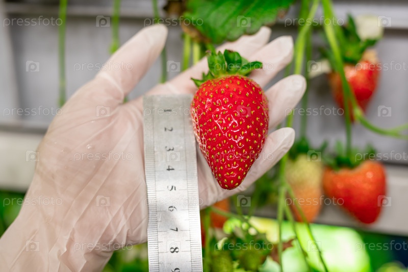 Перчатковая рука человека, держащего клубнику во время измерения ее длины