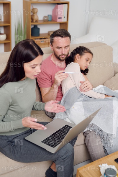 Молодая женщина описывает симптомы больной дочки онлайн врачу