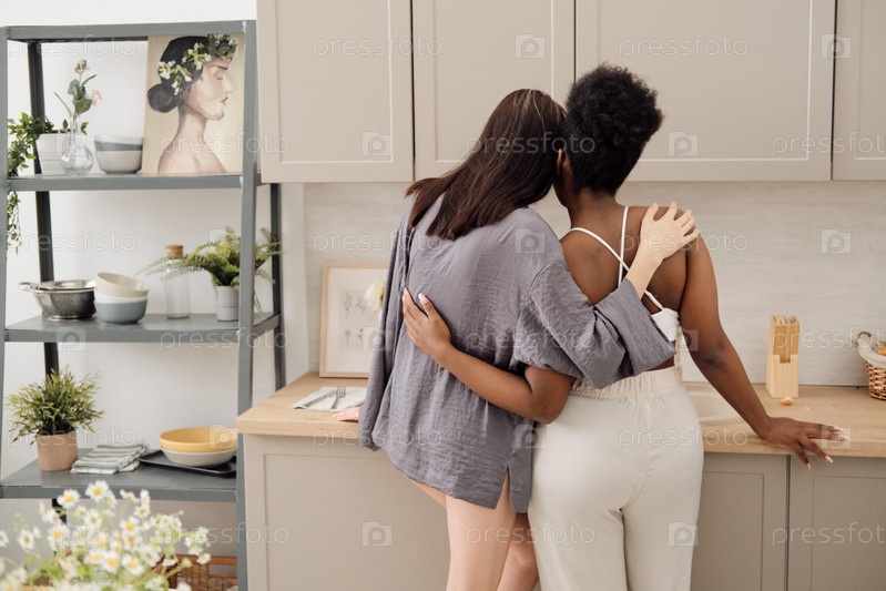 Задний вид лесбийской пары, стоящей в объятиях