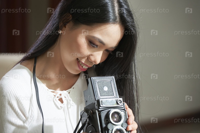 Удовлетворенный азиатский фотограф с камерой