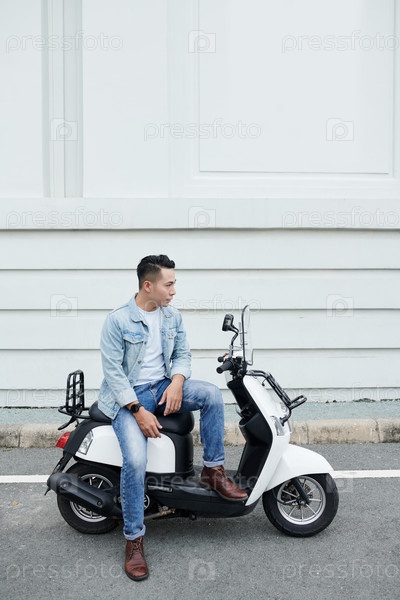Мужчина, сидящий на мопеде азиатский