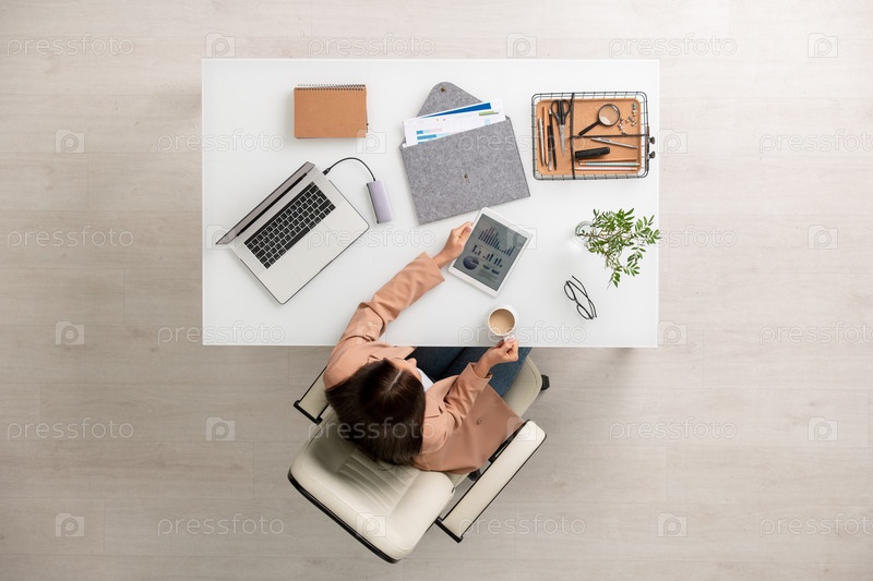 Обзор молодой бизнес-жены с планшетом, выпившей кофе и использующей планшет