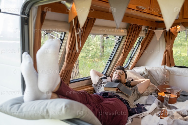 Молодой человек держит руки за головой, лежа на кровати в доме с колесами