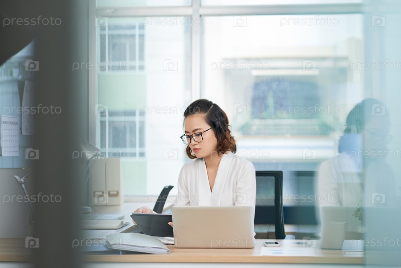 Серьезная деловая женщина читает отчет