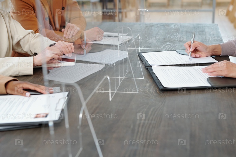 Руки работодателей, сидящих перед женщиной-заявителем, подписывающей контракт
