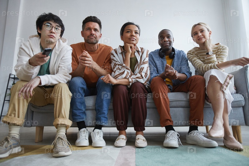 Разнообразная группа людей смотрит телевизор на диване
