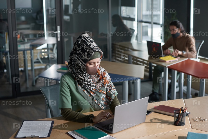 Мусульманка, печатающая на ноутбуке в офисе