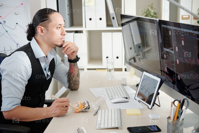 Трейдер ест при анализе фондового рынка