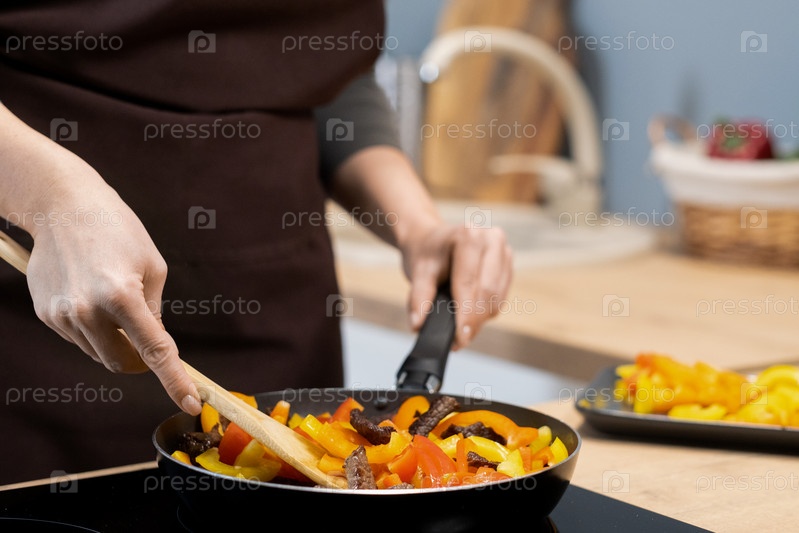 Руки молодой женщины, смешивающей рагу из овощей с деревянной ложкой