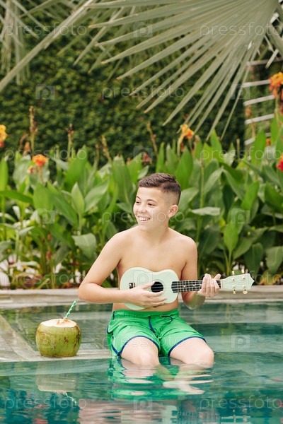 Мальчик играет на укулеле в бассейне