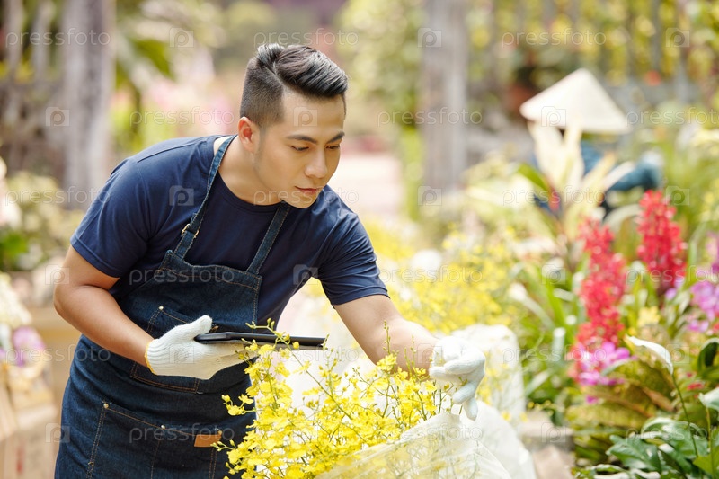 Работник проверяет цветение цветов
