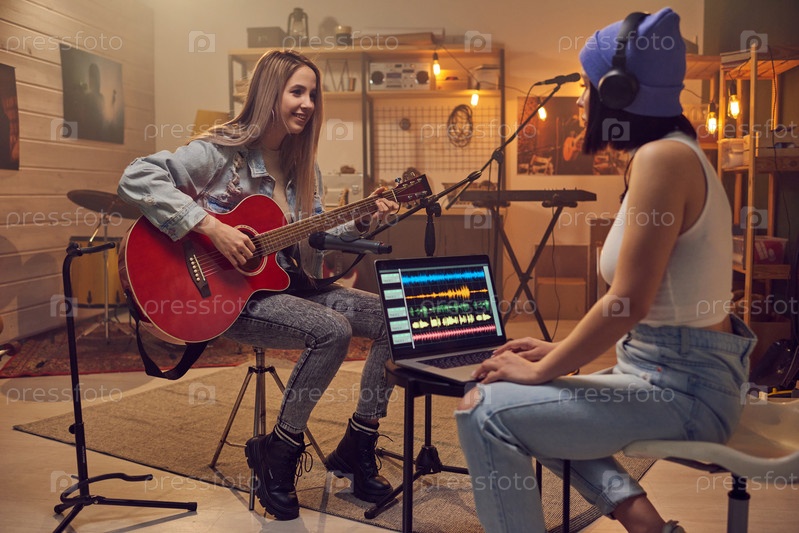 Две молодые женщины записывают новую музыку в студии