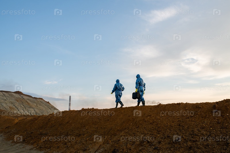 Фигуры двух современных экологов в защитных комбинезонах, движущихся на вершине холма с грязной почвой