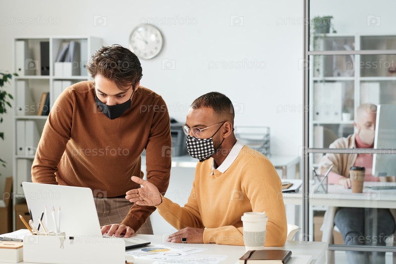Молодой менеджер на Ближнем Востоке указывает на экран ноутбука, готовя презентацию с коллегой во время пандемии коронавируса
