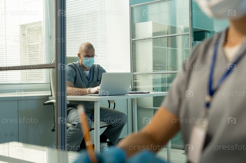 Медицинский ученый печатает отчет на ноутбуке