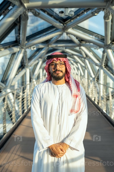 Успешный молодой арабский делегат в национальном костюме стоит перед камерой