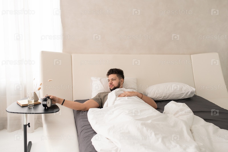 Молодой человек останавливает будильник утром