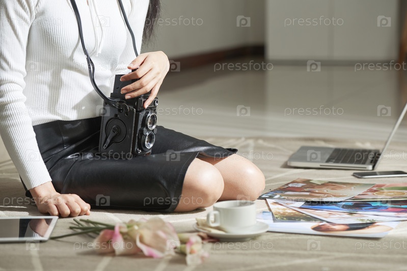 Фотограф, смотрящий на яркие печатные фотографии