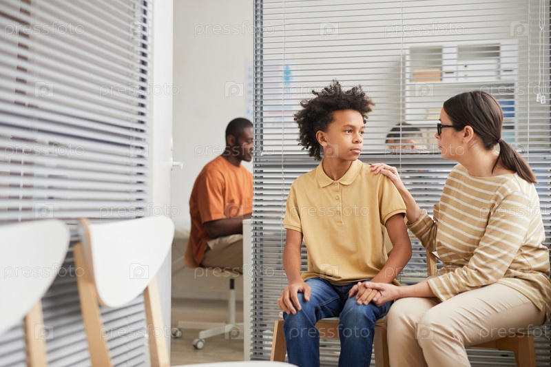 Мать, ожидающая в очереди с сыном