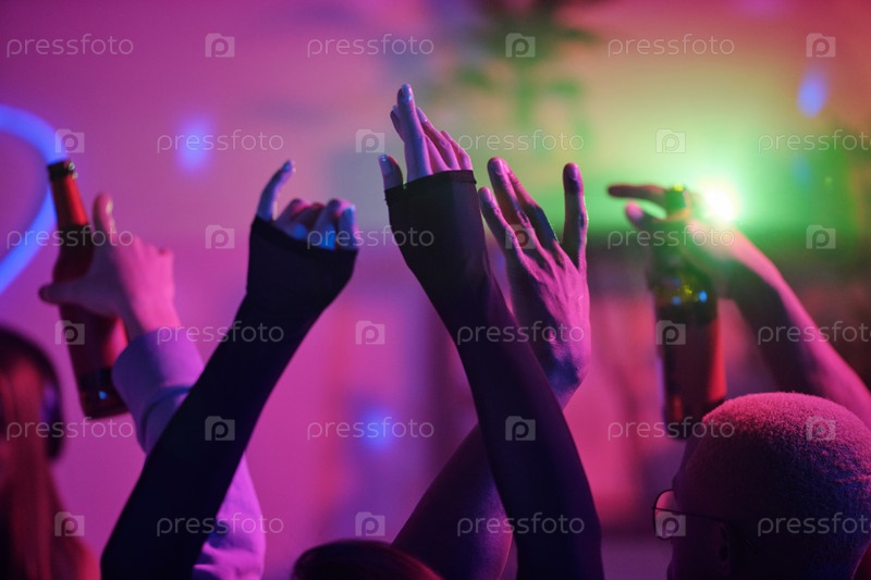 Поднятые руки молодых возбужденных межкультурных друзей, танцующих на домашней вечеринке
