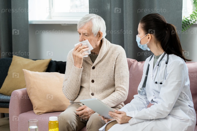 Молодая женщина-генеральный врач с цифровым планшетом смотрит на больного пожилого человека