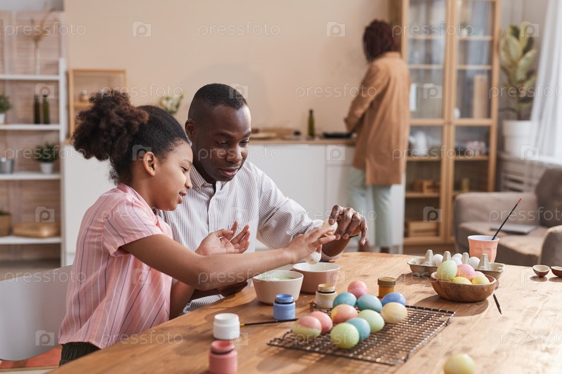Афроамериканская девочка рисует пасхальные яйца с любящим отцом