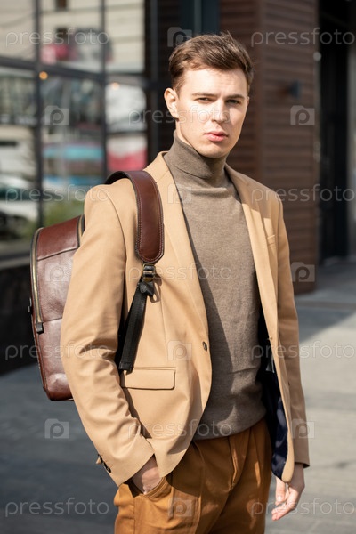 Молодой серьезный бизнесмен в бежевом куртке и сером свитере смотрит в сторону