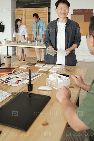 Счастливая молодая женщина-дизайнер или архитектор консультируется с коллегой