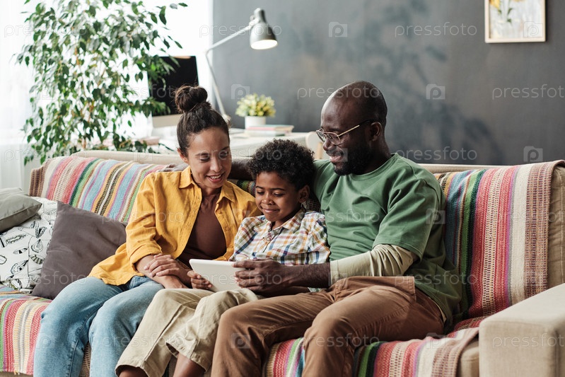 Семья, использующая планшетный компьютер дома