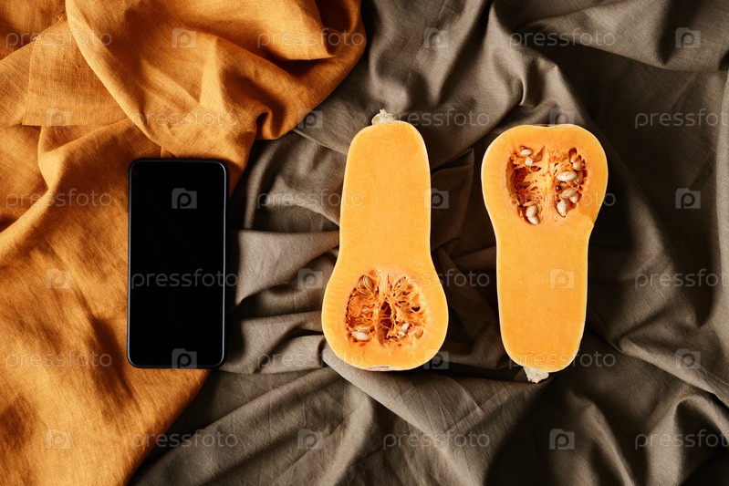 Непосредственно над видом смартфона и двумя кусками тыквы, помещенными на оранжевых и серых морщинистых тканях