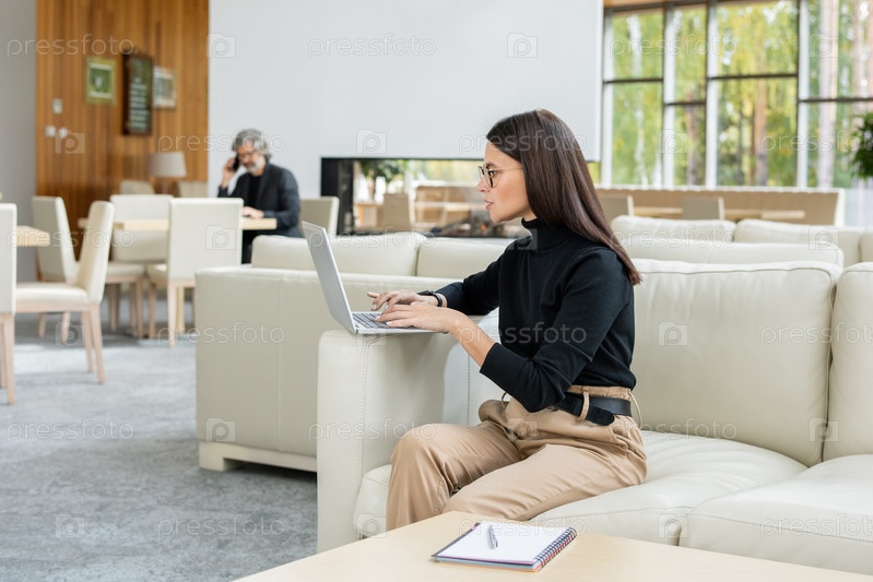 Серьезная молодая бизнесвумен анализирует финансовые данные онлайн перед ноутбуком