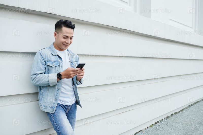 Счастливый азиатский мужчина серфирует по сети на гаджете