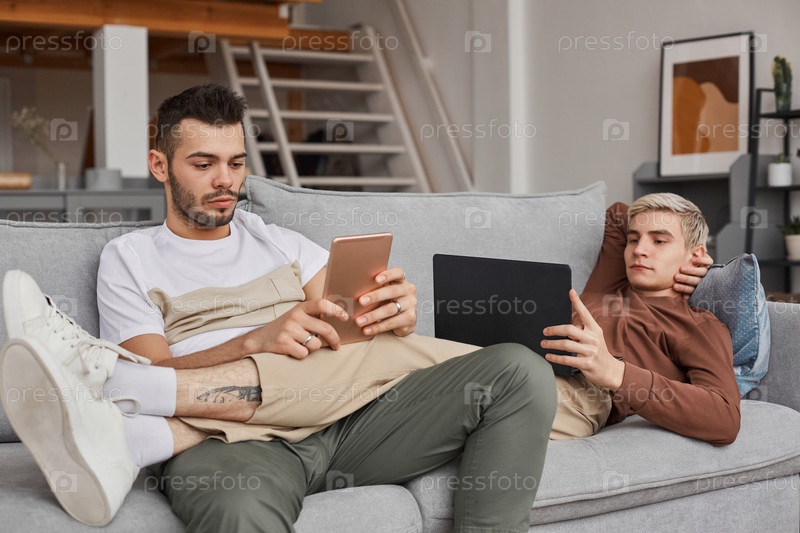 Два молодых человека отдыхают на диване