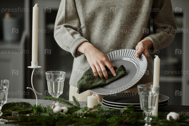 Женщина, устанавливающая обеденный стол для рождественского ужина