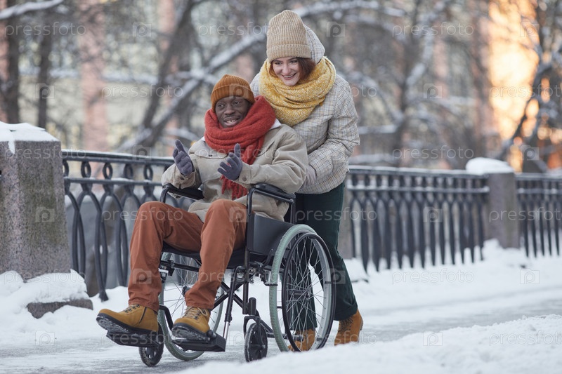 Пользователь инвалидной коляски развлекается зимой