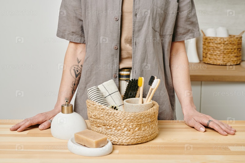 Человек, стоящий за корзиной с вещами для ухода за телом