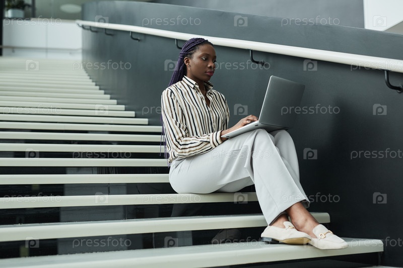 Деловая женщина, использующая ноутбук в офисной вестибюле
