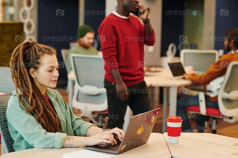 Молодая деловая женщина с дредоликами сидит за столом перед ноутбуком