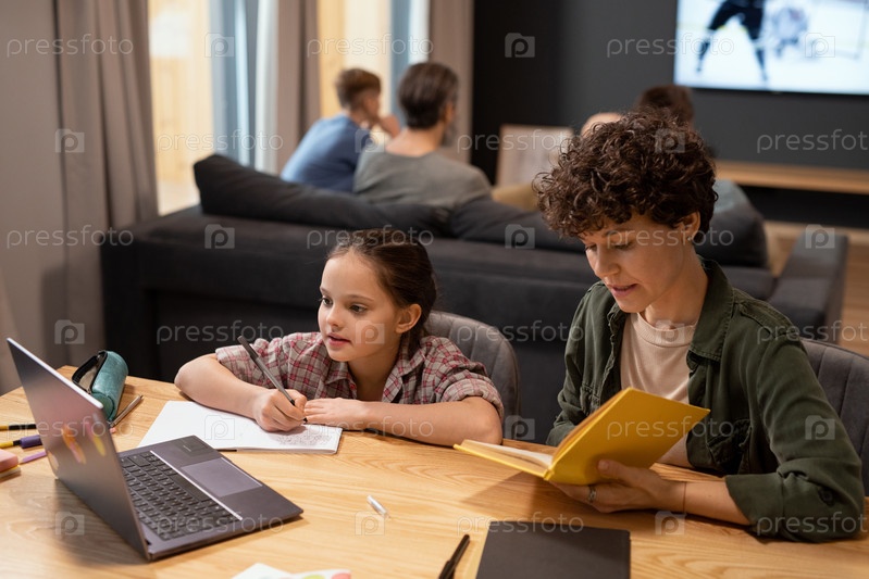 Молодая женщина с открытой книгой читает текст, сидя рядом со своей милой дочерью