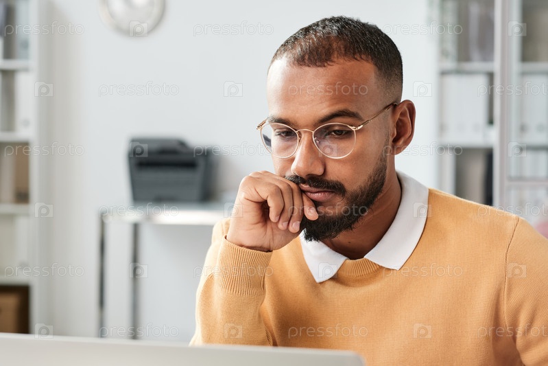 Вдумчивый молодой ближневосточный мужчина в очках, опирающийся головой на руку во время работы с аналитикой в офисе