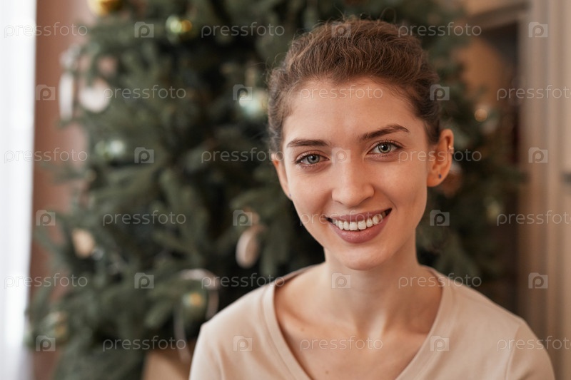 Молодая женщина против рождественской елки