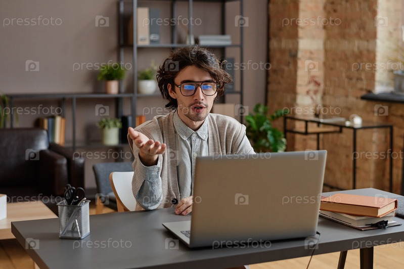 Горизонтальный средний снимок профессионального психолога, сидящего за столом в своем офисе и работающего с пациентом онлайн по видеозвонку с помощью ноутбука