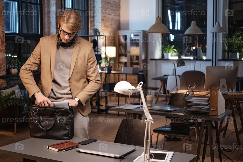 Серьезный молодой блондин-менеджер с наушниками вокруг шеи кладет планшет в сумку, покидая офис