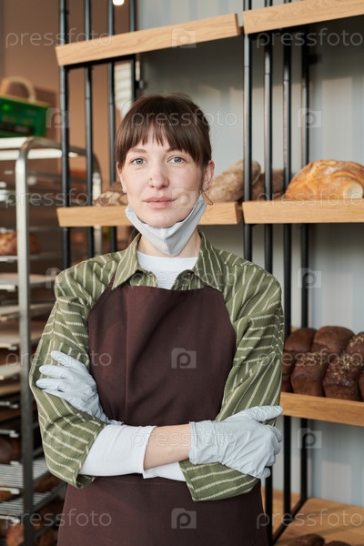Женщина в маске продает свежий хлеб