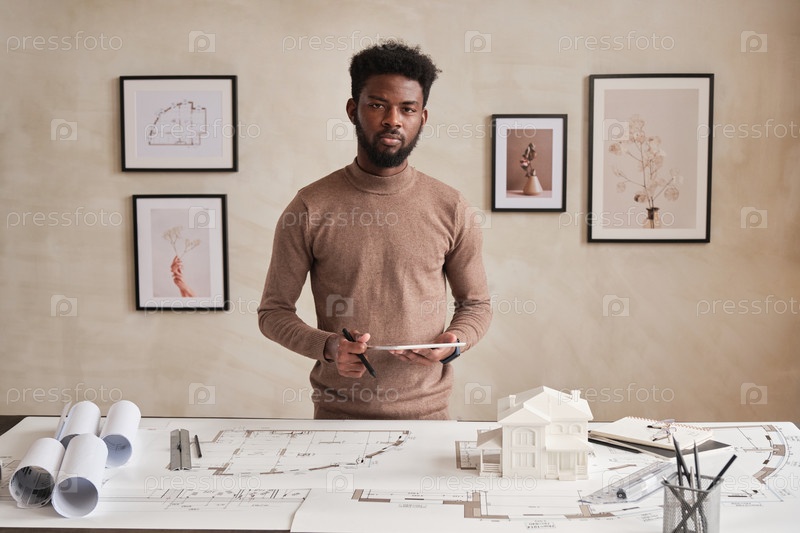Портрет бородатого черного архитектора с планшетом
