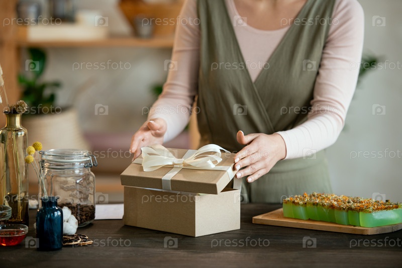 Руки молодой женщины упаковывают палочки свежего натурального мыла ручной работы в коробку для подарков