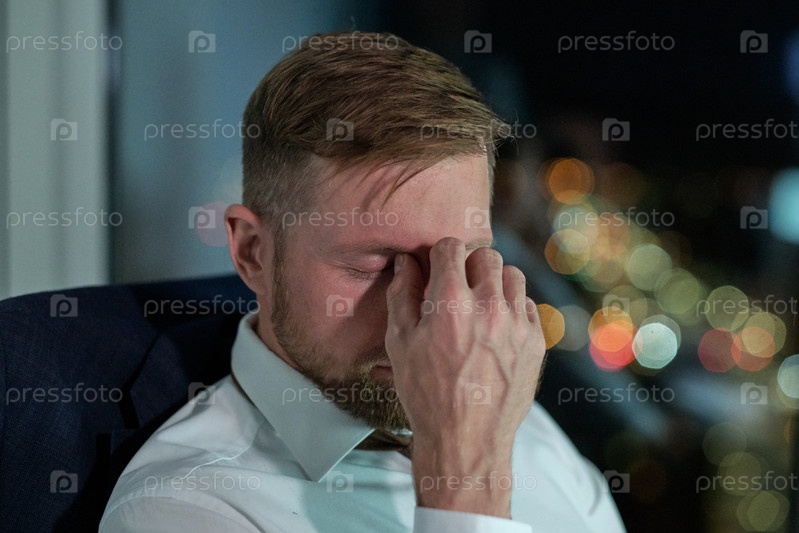 Молодой изможденный бизнесмен с закрытыми глазами касается его лица