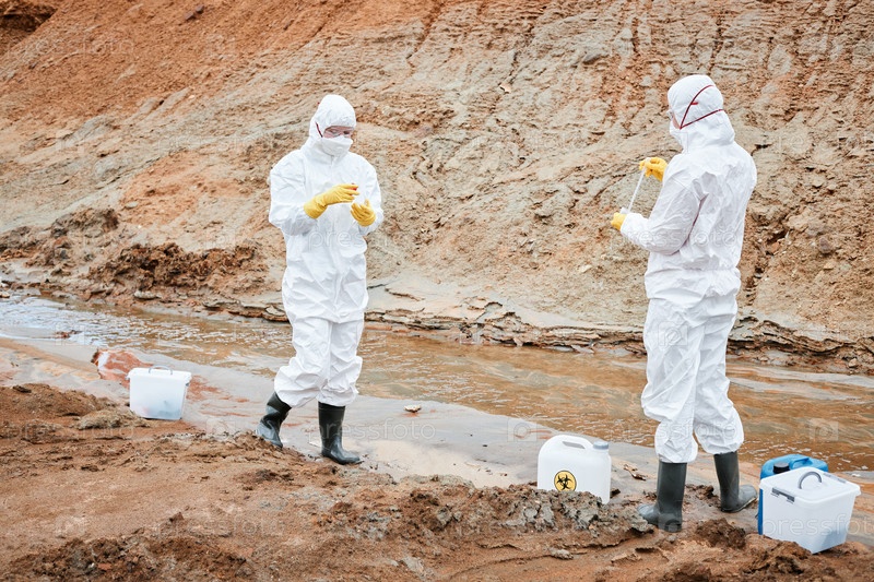 Ученые-экологи в масках, перчатках и защитных костюмах работают с токсичными веществами на загрязненных территориях
