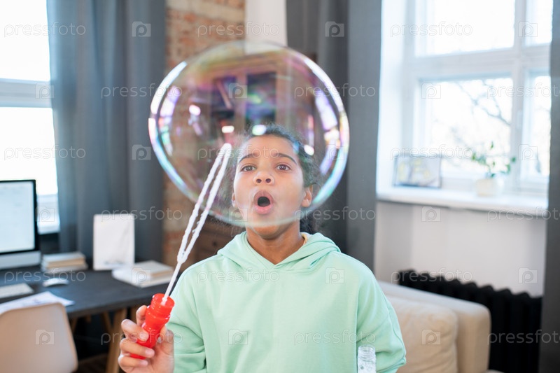 Девочка начального возраста в повседневной одежде дует огромный мыльный пузырь в гостиной