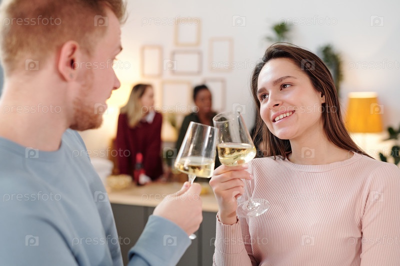 Счастливая молодая брюнетка, играющая на флейте с шампанским вместе со своим парнем